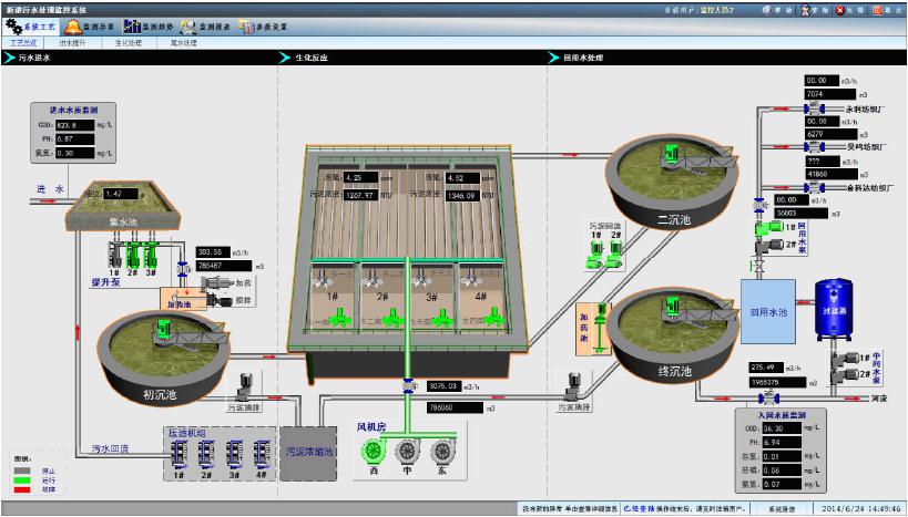 对加氯间、接触池、污泥泵房、回用水提升泵房,最终沉淀池内的设备进行状态检测和控制。